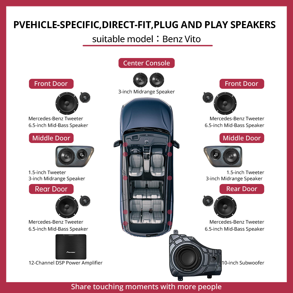 Conçu exclusivement pour Mercedes-Benz Vitopas de modifications, compatibilité totale et son de qualité studio dans votre fourgon !